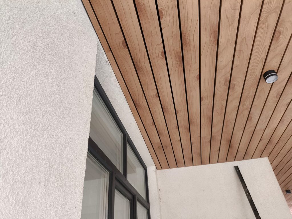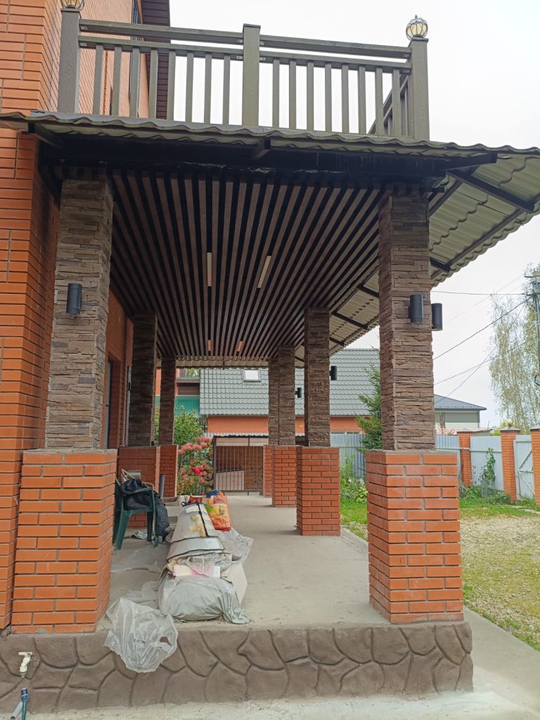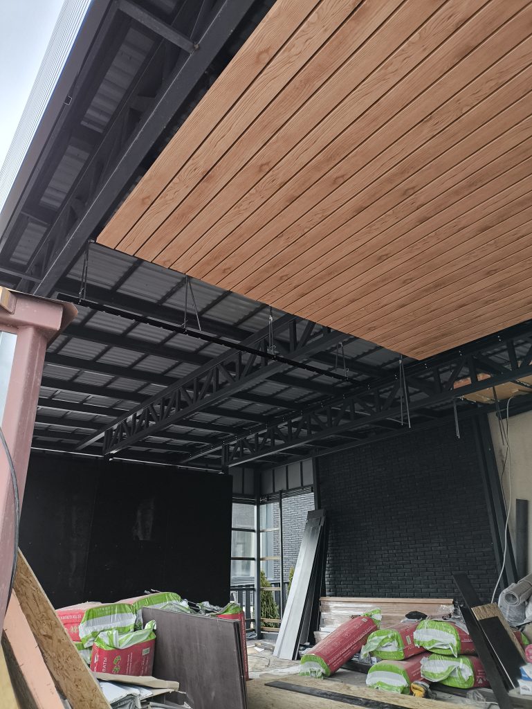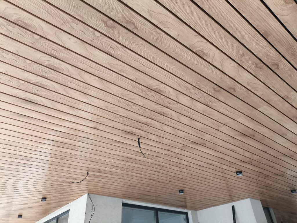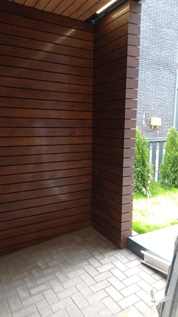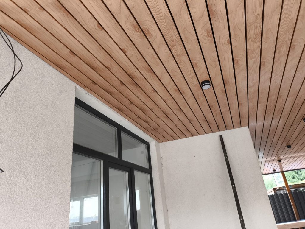 Проект Навес Загородного дома. Потолок панель 100/30-10 Орех 3Д. Стены Панель 100/30-10 Античный Дуб 3Д.
